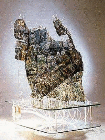 | (株)富士写真フィルムの協力により、ピクトログラフィー3000用 A4 OHP Film 半裁 の大きさに出力した部分画像を熱変形して43枚繋いである。銅線、テグス、 光ファイバー、ビニールパイプ、ガラス板、プラスティク等 ビデオプロジェクター照明入力で鑑賞。 W 70cm, D 55cm, H 110cm |